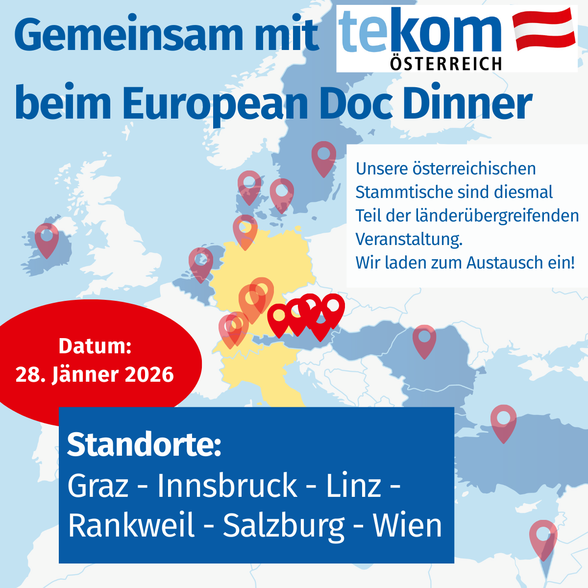 Daher findet am 28. Jänner 2026 tekom-weit der erste Europastammtisch ("European Doc Dinner") statt. Aus rund zehn Ländern gibt es bereits Zusagen für eine Teilnahme in jeweils einer oder mehreren Städten, es könnten noch mehr werden.